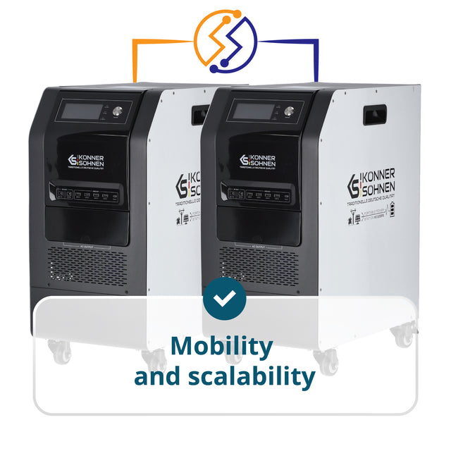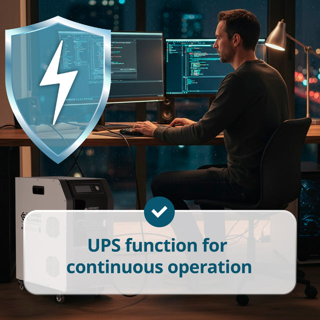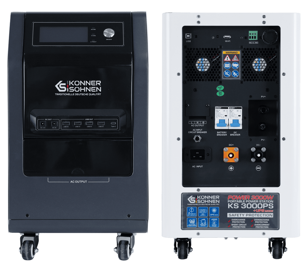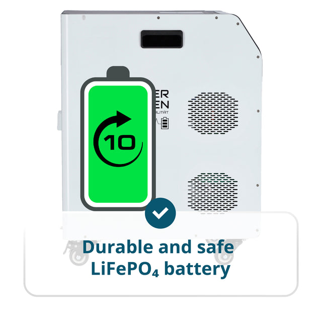 | Különleges jellemzők | 24V DC kimenet generátorhoz vagy akkumulátorhoz, Tiszta szinuszhullámú inverter, LiFePO₄ 3,2 kWh, MPPT vezérlő, UPS < 10 ms, Tandem Power támogatás, Gyors töltés akár 80%-ra 1 óra alatt, Túlterhelés és túlmelegedés elleni védelem, LCD monitor kijelző, Kerekek és fogantyúk a mobilitáshoz |