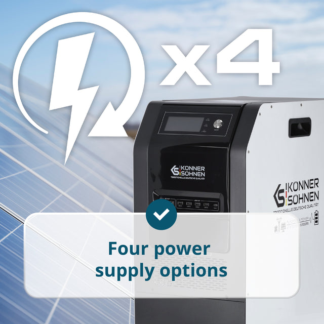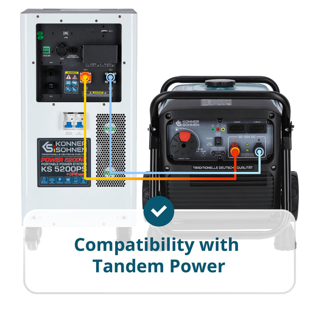 | Különleges jellemzők | 48V DC kimenet generátorhoz vagy akkumulátorhoz, Tiszta szinuszhullámú inverter, LiFePO₄ 5.12 kWh, MPPT vezérlő, UPS < 10 ms, Tandem Power támogatás, Gyors töltés akár 80%-ra 1 óra alatt, Túlterhelés és túlmelegedés elleni védelem, LCD kijelző paraméterfigyeléssel, Kerekek és fogantyúk a szállításhoz |