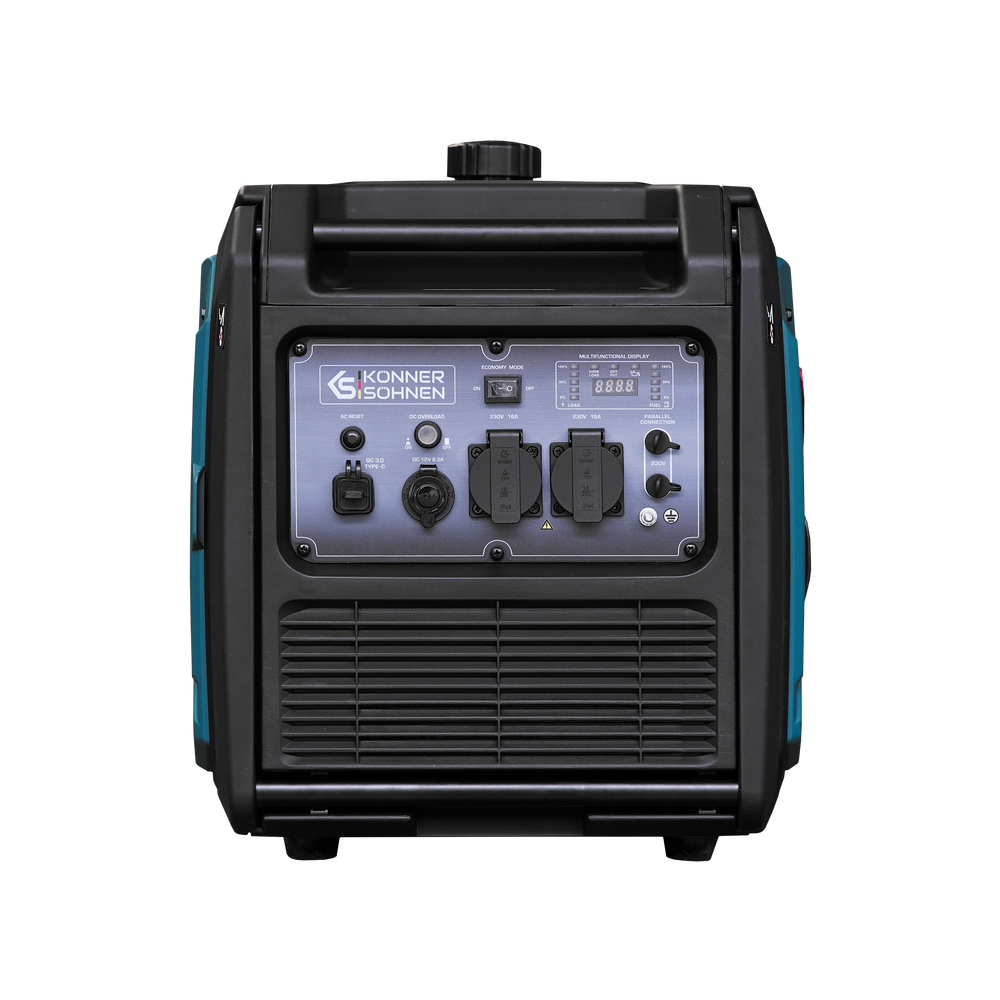 The KS 4000iEG S inverter generator, which can run on two types of fuel, provides a maximum power output of 4.4 kW (10% less when running on LPG) for backup power at home, camping, or construction sites. The closed housing reduces noise levels compared to open-frame models, while inverter technology ensures clean, safe power for sensitive electronics. Dual-fuel capability provides both savings and flexibility. The 13 L tank and Eco mode extend runtime, while wheels and a handle make transport easy. The LED display, USB ports, 12V DC output, and 2×230 V Schuko sockets make it modern and convenient to use. Euro 5 compliant.