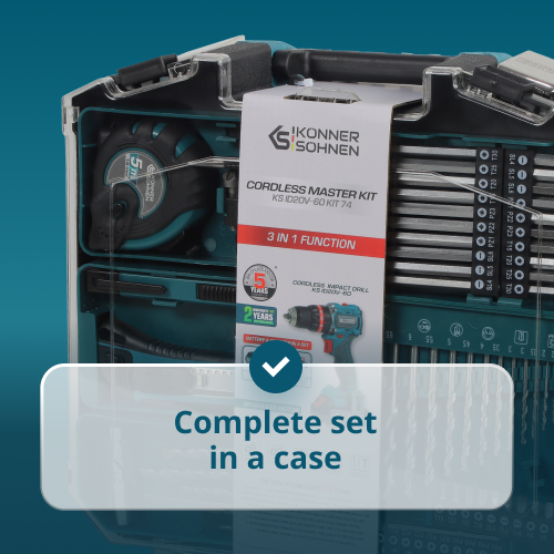 KS ID20V-60 KIT 74 is a tool set in a case that includes a cordless impact drill, a 74-piece accessory kit — bits, drill bits, and attachments, a 2 Ah battery, and a 2.4 A charger. The drill features three modes of operation: drilling, screwdriving, and impact drilling (28,500 bpm), allowing you to drill metal or wood, while two gears and 23 torque settings ensure precision for any task. The brushless motor delivers up to 60 Nm of torque, operates quietly and efficiently. For comfortable use, it includes a rubber-coated handle, LED light, and a belt loop. The safety system includes protection from overheating, overload, and over-discharge.