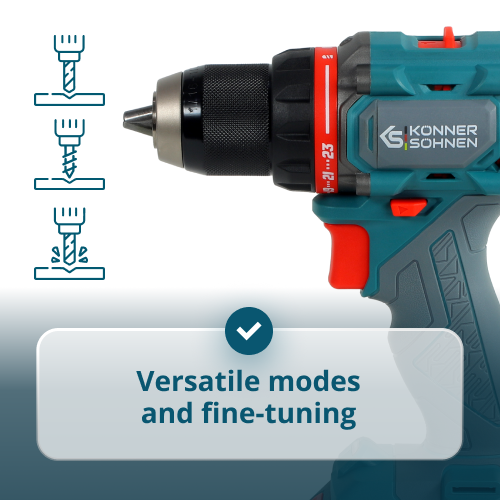 - Universal modes and precise adjustment – the tool features 23 torque positions, providing precise adjustment of fastening force for different materials and fastener types, and 3 operating modes — drilling, screwdriving, and impact drilling with an impact rate of up to 28500 bpm.
