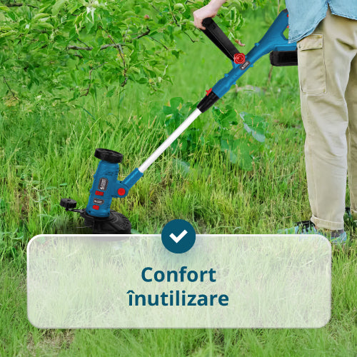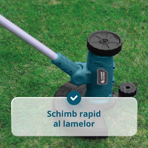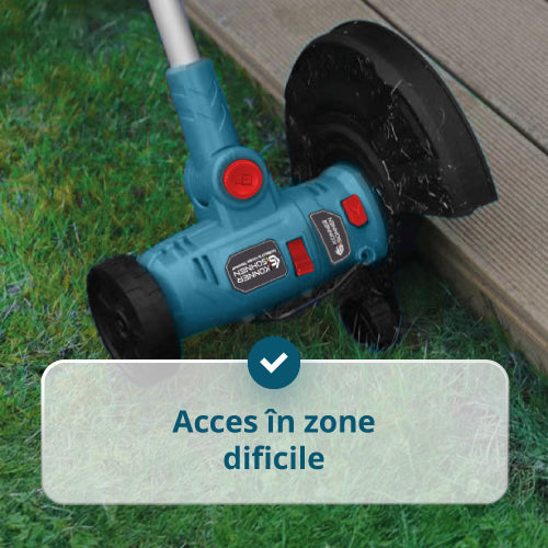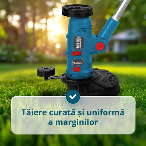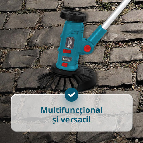 Trimmerul poate tunde, tăia margini, mătura și curăța rosturi datorită capului reglabil și celor 3 capete interschimbabile.