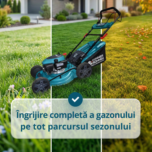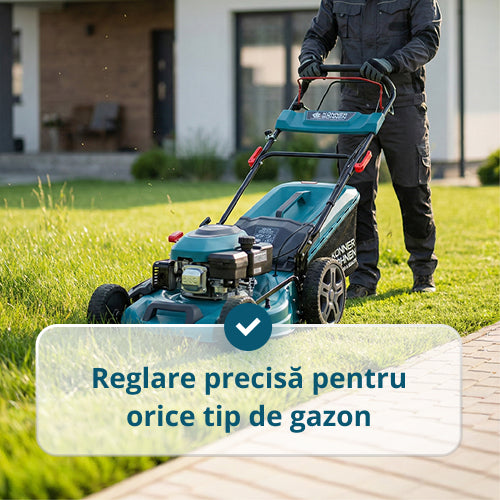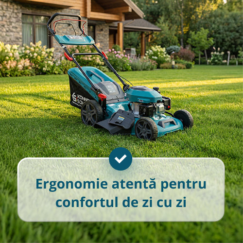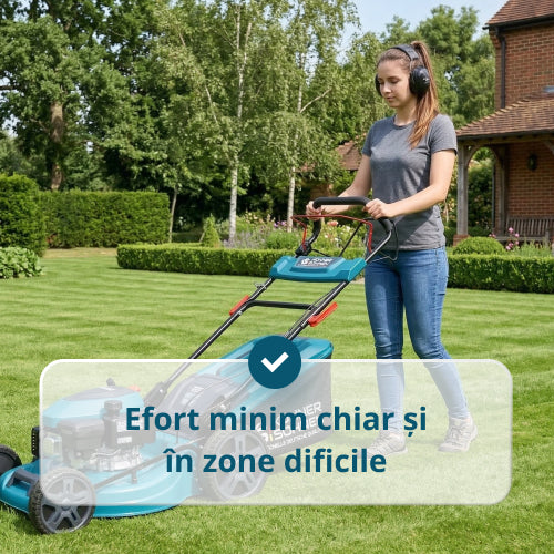 Tracțiunea pe roți permite mașinii de tuns gazon să se deplaseze autonom, reducând semnificativ efortul fizic al utilizatorului în timpul lucrului îndelungat pe suprafețe mari și pe pante.