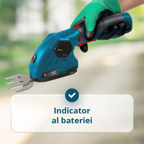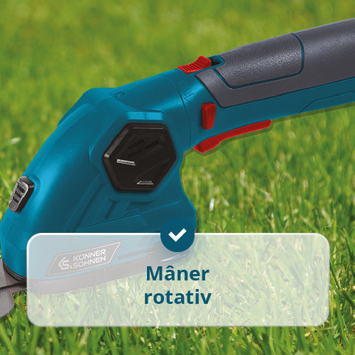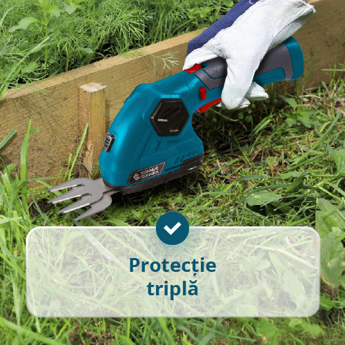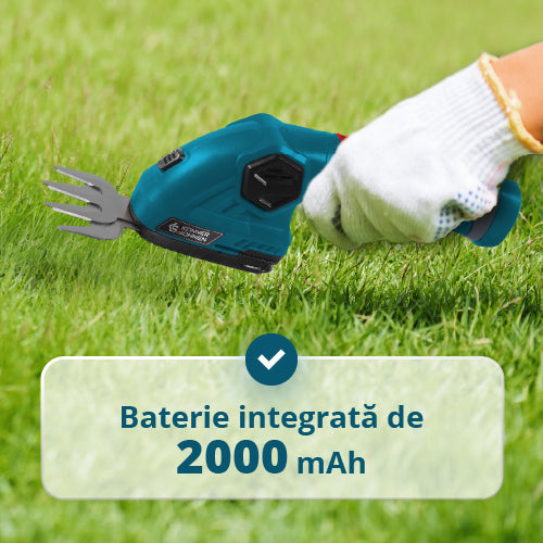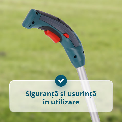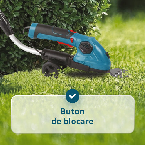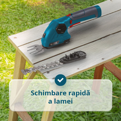 Pachetul include | Foarfecă, Lamă pentru gard viu, Lamă pentru iarbă, Cablu de încărcare USB/Type-C, Manual de utilizare, Comutator de siguranță, Tijă de extensie |